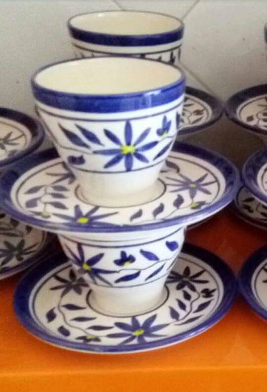Tasse et sous-tasse en pâte à feu et froid fabriquées par Poterie et Céramique Garsi à Nabeul.