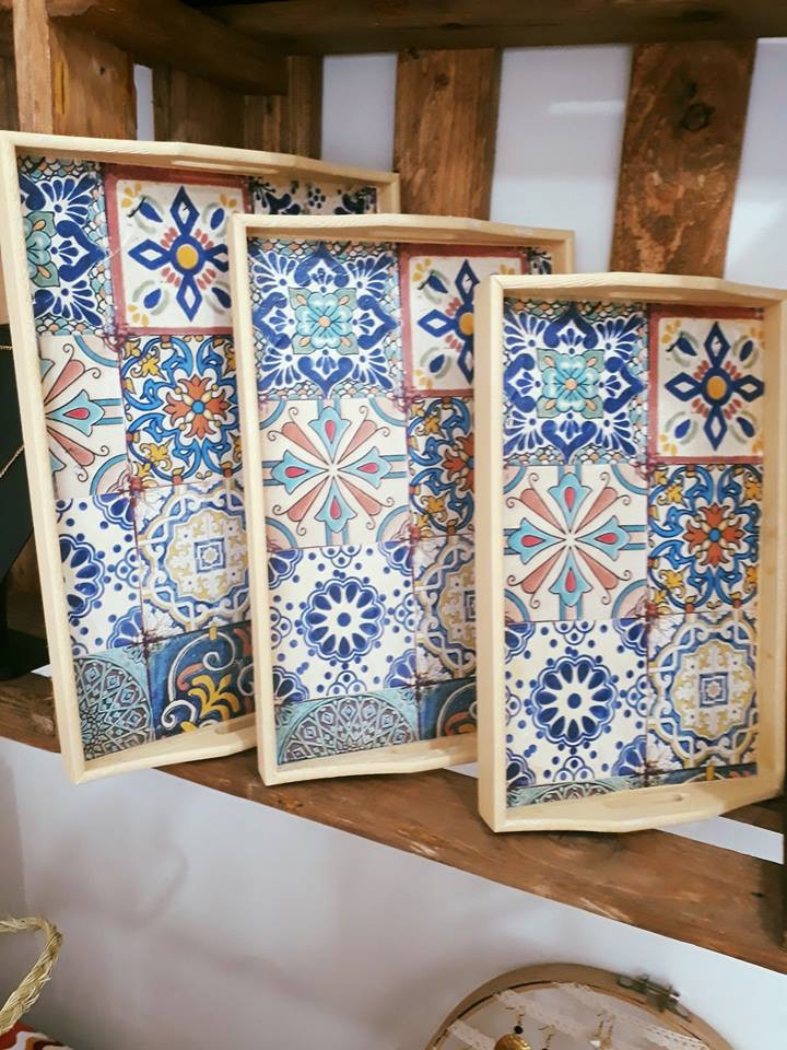 Plateau tounsi en bois motif faïence, création de Cagnotte ElKanawita à Sidi Rezig.