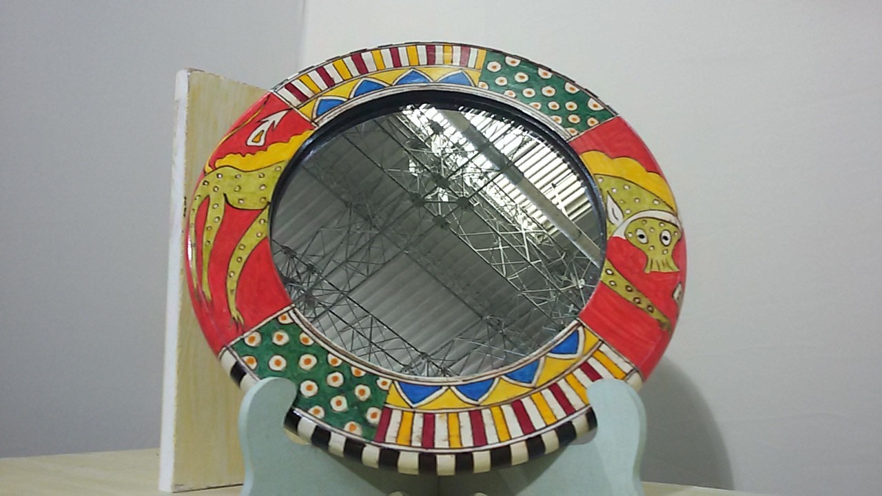 Miroir en bois peint, création de "Le Bois Peint Art" à la Soukra. Les prix varient en fonction de la taille du miroir, 65dt, 80dt, 180dt et 320dt.