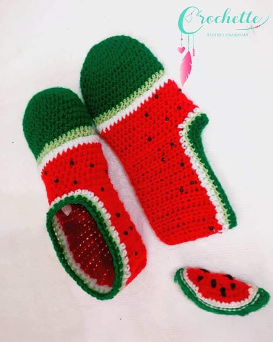 Pantoufles en crochet en motif de pastèque, création de Atelier Crochette à Mahdia.