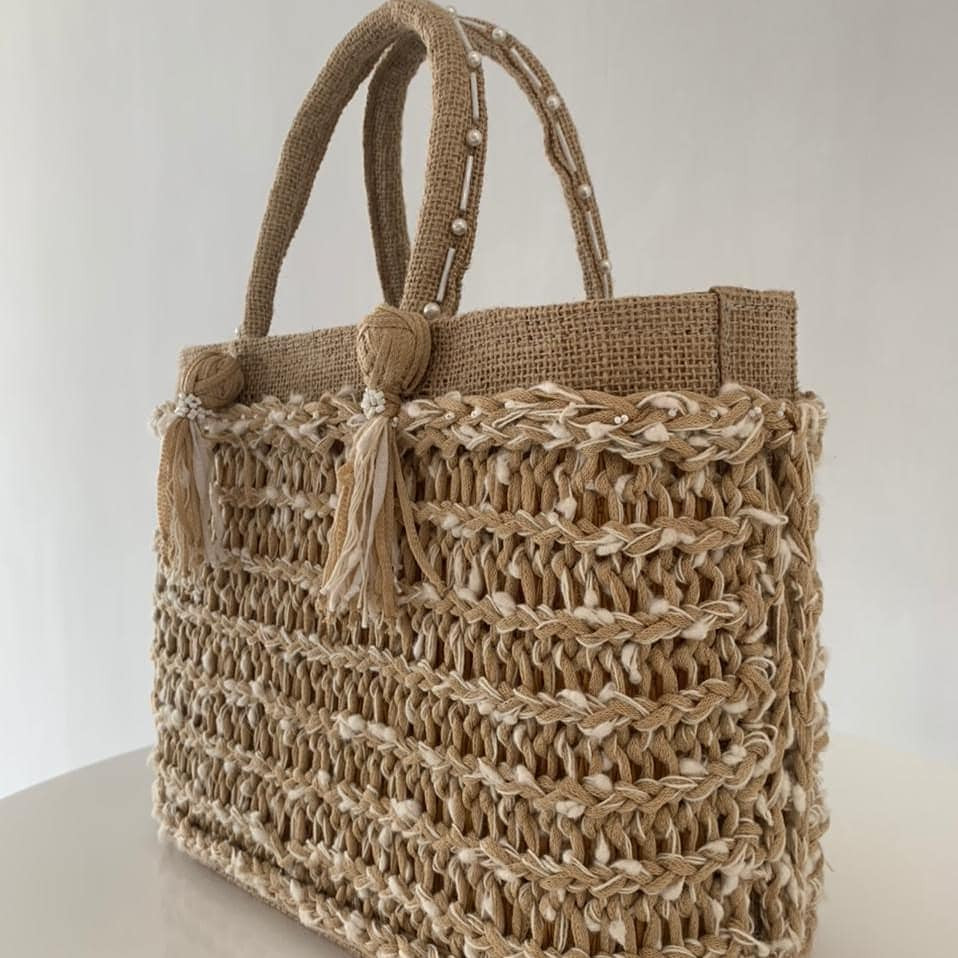 Sac couffin beige tricoté en fibres naturelles en pièce unique, création de Kofa aux Jardins de Carthage.