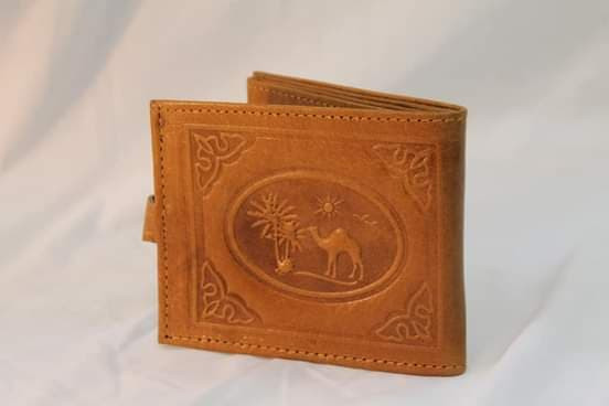 Portefeuille camel en cuir, création de "Artisanat Vrai Cuir" à Ezzahra.