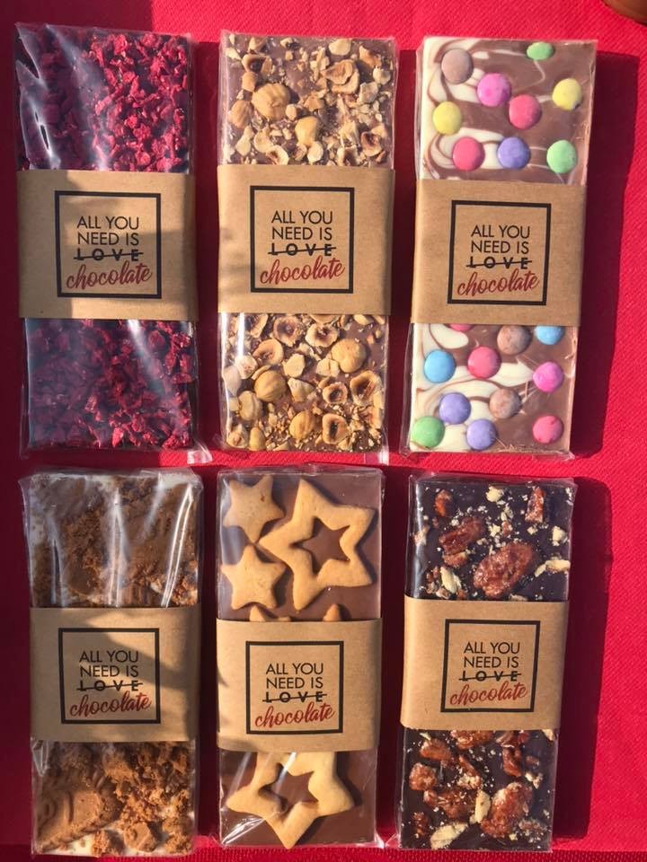 Tablettes de chocolat aux divers parfums (noisettes, speculos, framboise,caramel, amandes) préparées par Riky's Goodies à Menzah 7. La grande tablette est à 19dt.